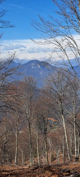 Weiter ging es bergan nach Brinzio. Von diesem Ort aus begann der zweite starke Anstieg des Tages zum Monte Tre Croci mit 1.111m. Als Belohnung für den Aufstieg hatten wir sehr schöne Ausblicke. Bald erreichten wir den Punto panoramico attrezzato Sud wo der weitere Weg durch einen Bauzaun wegen Baumfällungen gesperrt war. Am Zaun war eine Karte mit teilweiser Umleitung angebracht. Dies war jedoch für uns nicht hilfreich da es in der Mitte des gesperrten Wegs keine Lösung gab. Wir fragten einige Leute die den schönen Ausblick am Abend genossen welche Alternative es gäbe. Als Antwort wurde uns gesagt dass wir uns wegen der Sperre keine Gedanken machen sollten sondern den Weg wandern könnten. Also gingen wir durch den Zaun und auf der Waldstraße weiter. Bald kamen wir an einigen Holzfällermaschinen vorbei. Auch konnten wir an den Hängen sehen wor gearbeitet worden war. Schließlich hatten wir genug für heute und fanden einen guten Platz zum Cowboycampen. Das war ein anstrender erster Tag und ich war froh als ich mich hinlegen konnte.