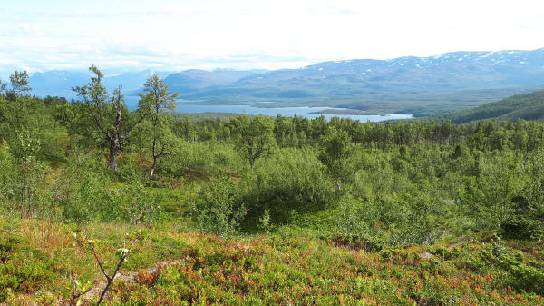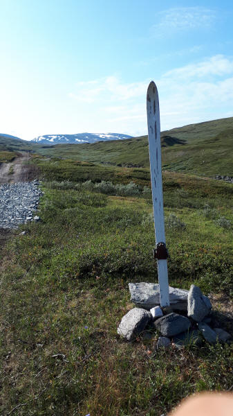 Wie so oft startete ich bevor die anderen aufgestanden waren. Als erstes ging es über den Damm des Sees Altevatnet. Am anderen Seeufer war ein Tunnel im Bau, der das Wasser von einem Fluss zur Elektrizitätsgewinnung umleiten soll. Der Weg folgte jetzt einer für die Tunnelbaustelle noch teilweise im Bau befindlichen Straße. Danach verlief der Nordkalottleden immer bergauf auf Allradspuren am Fluss Salvvasjohka entlang. Den ganzen Tag über war es sonnig mit nur wenigen Wolken. Über das Fjell war der Weg oft nass und matschig. Unterwegs konnte ich eine Samensiedlung sehen. Am Fjellende ging es wieder bergab Richtung See Torneträsk in Schweden. Es war ein langer Weg bis zur Lappjordhytta. Dies ist die letzte auf norwegischer Seit kurz vor der Grenze nach Schweden. Ich stoppte hier für meine Verhältnisse früh um 18:00 Uhr. Hier traf ich auf ein Paar aus Südtirol die mich am Morgen überholt hatten.