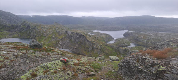 Meine Mittagspause legte ich ein bevor ich die Gabelung der Wege nach Stranddalen und Krossvatn erreichte. Ich fand etwas Schutz vor dem Regen unter einem überhängenden Felsen. Ich entschied mich dann für den Weg nach Standdalen auch wenn es heute der längere war. Aber dafür würde es morgen viel einfacher werden. Es blieb weiterhin steinig und ging ständig auf und ab mit vielen kleinen Seen und Teichen. Dann ging es am Abhang vom Berg Ravnanuten entlang. Hier kam ich nur langsam voran. Nach 20:00 Uhr traf ich schließlich an der DNT Stranddalen Turisthytta ein. Ich wurde schon erwartet da ein anderer Wanderer den Hüttenwirt über mein späteres ankommen informiert hatte. Ich zug meine Regensachen aus und machte mich über das Bufet her. Der andere Wanderer und ich waren die letzten Abendgäste. Das Essen schmeckte sehr gut und ich konnte mich satt essen. Danach noch kurz geduscht und ich legte mich hin.