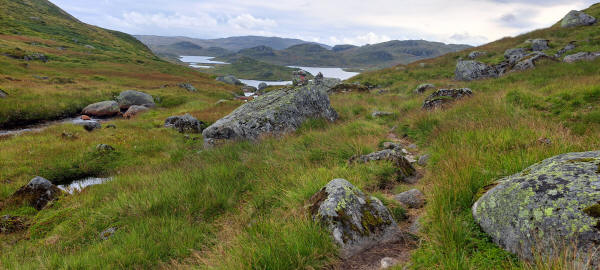 Die Brücke an der Hütte Svartenut war leider zerstört. Also musste ich sehen wo ich den Fluss queren konnte. Die beiden Jäger zeigten mir wo ich trockenen Fusses rüber gehen konnte. Nachdem ich mich ein bischen umgesehen hatte fand ich den richtigen Punkt. Der Wetterbericht hatte von Regen gesprochen. Zum Glück blieb es den ganzen Tag über trocken. Der Weg war einfach zu wandern und hatte auch nur wenige Steine. Nur einige nasse Stellen gab es. Als ich am Fluss Skrubssåni ankam musste ich meine Stiefel aus- und meine Crocks anziehen.Der Fluss war zu tief. Den ganzen Tag über hatte ich nur zwei Wanderer getroffen.
